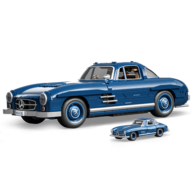 La joya de la corona: el Mercedes-Benz 300 SL con 1.600 piezas, interiores de tela, acabados metálicos y un cochecito die-cast exclusivo que viene con su propia vitrina. Para presumir en el salón.