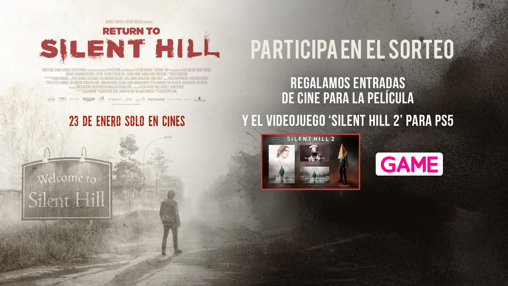 Regalamos 5 packs de 6 entradas (válidas para cualquier cine donde se estrene la película, sesión y día) y 1 juego de edición especial Deluxe de Silent Hill 2, por cortesía de Game. El juego incluye: