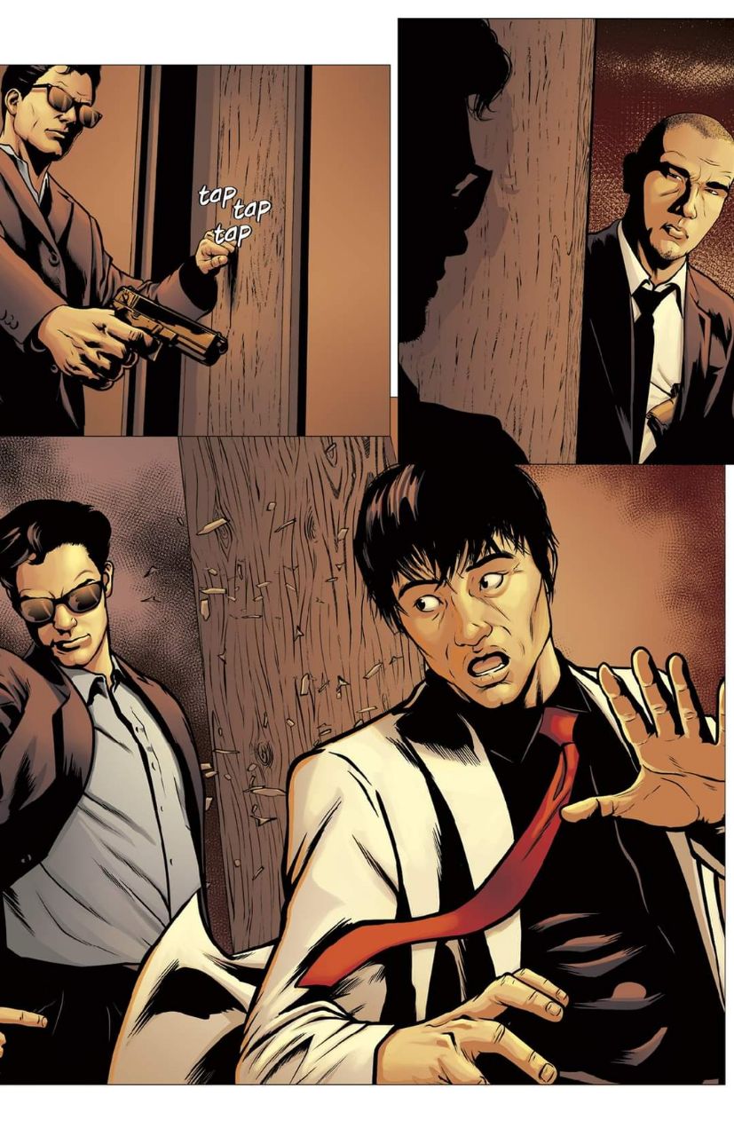 Pues bien, el inmenso trabajo que Dark Horse ha puesto en circulación en EEUU a finales del año 2023, crea una alianza entre Hill y el guionista Mike Benson, autor de otras obras gráficas en torno a superhéroes como Punisher, Luke Cage, Lobezno o Moon Knight y para televisión en shows como Big Wolf on Campus o Entourage. Caín pone igualmente en contacto al cineasta de Long Beach con dos artistas españoles afincados en el mercado estadounidense. Nacido en Valladolid, el ilustrador Beni R Lobel, es autor de precuelas gráficas de films como After Earth o Avatar. Su estilo entre claroscuro y realista puede verse en la portada del cómic, que es creación suya. El nombre del protagonista, que contiene numerosos agujeros de balas, transita en la entre la luz rosada del neón de caracteres chinos y la oscuridad plena, hacia la derecha de la portada. La silueta del protagonista, en color verdoso (fruto del reflejo de una luz fuera de campo), portando una de sus automáticas, recorre de izquierda a derecha la cubierta, en paralelo a su nombre.